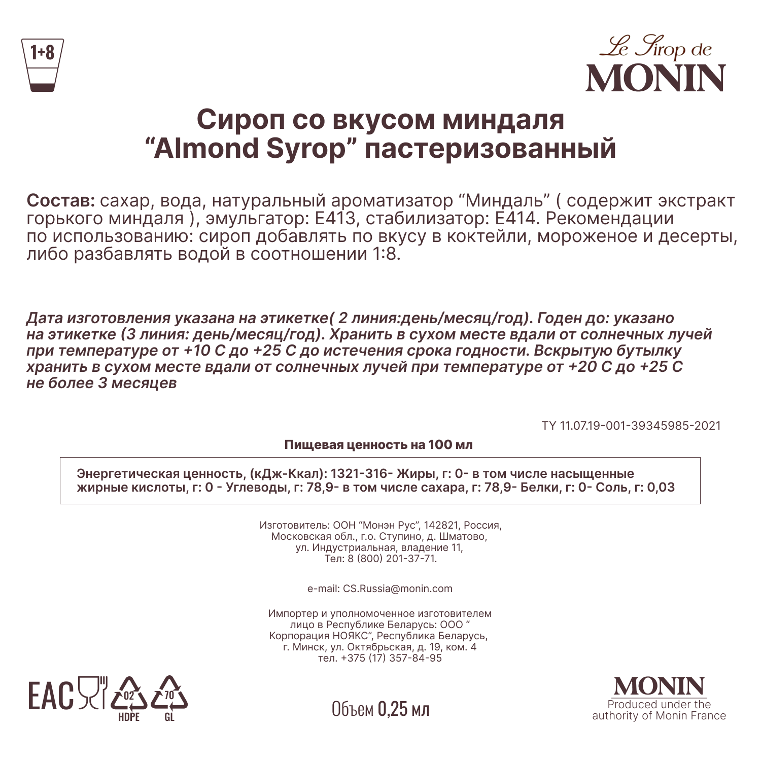 Купить Сироп MONIN "Миндаль", 250 мл.