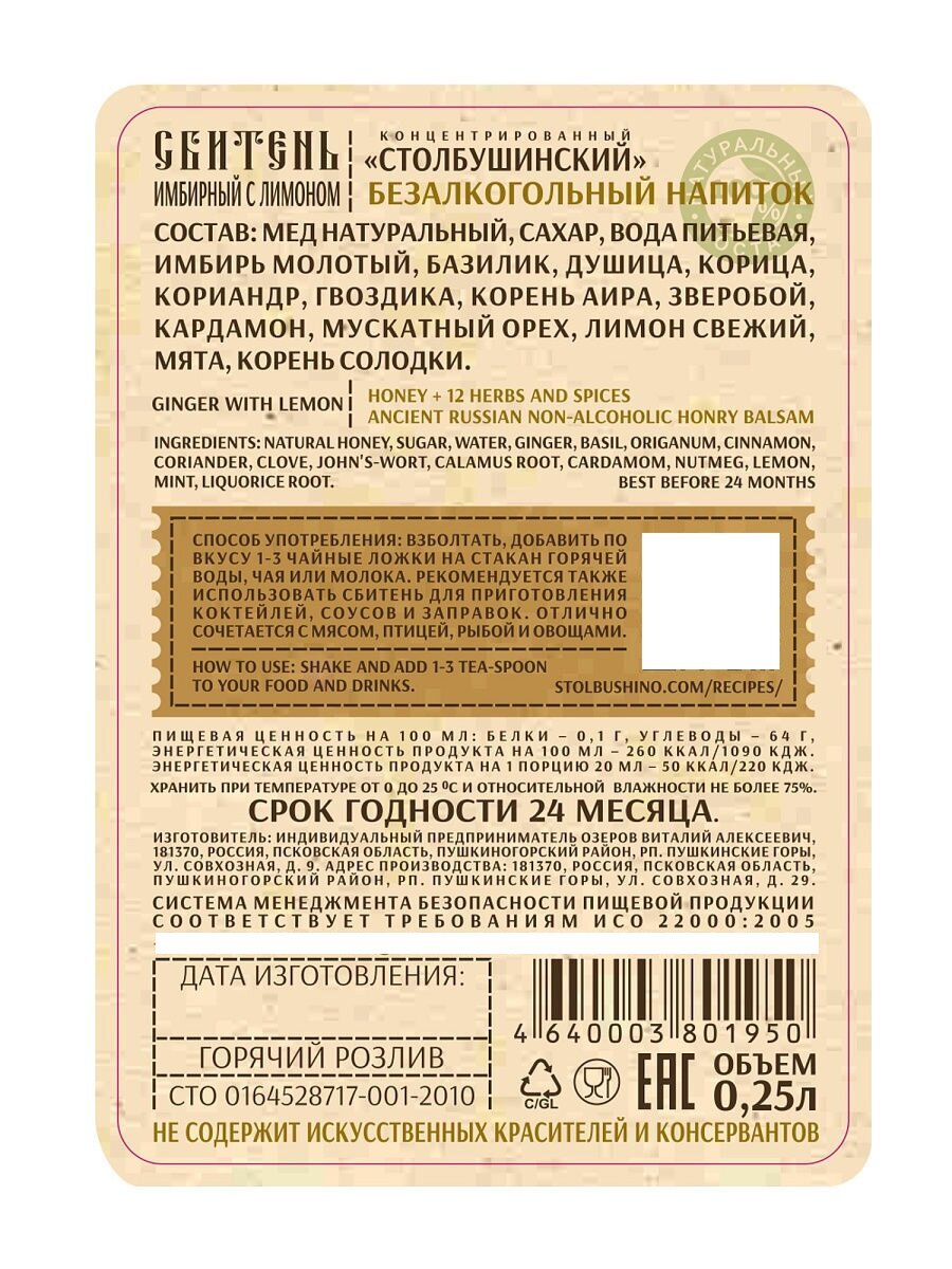 Сбитень Имбирный с лимоном без сахара сироп медовый с пряностями и травами Столбушино, 0.25 л