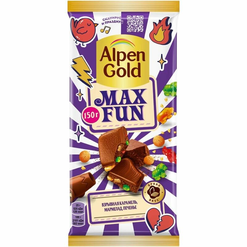 Плиточный шоколад, "Alpen Gold", "Max Fun", молочный, взрывная карамель, мармелад и печенье, 150г