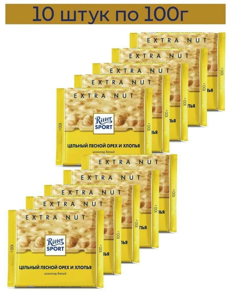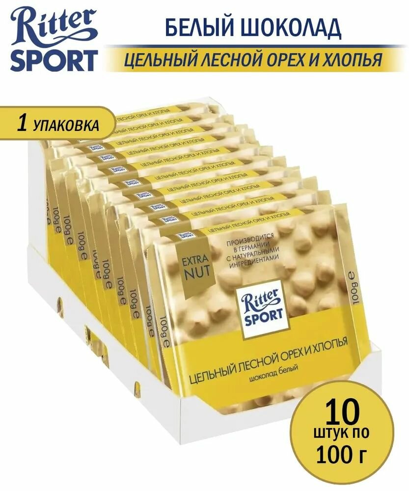 Шоколад Ritter Sport Extra Nut белый цельный лесной орех и хлопья, 100 г, 10 шт.