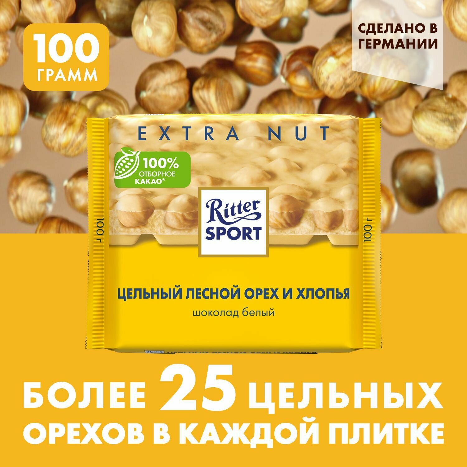Шоколад RITTER SPORT "Extra Nut", белый с цельным лесным орехом и хлопьями, 100г, Германия, ш/к01008
