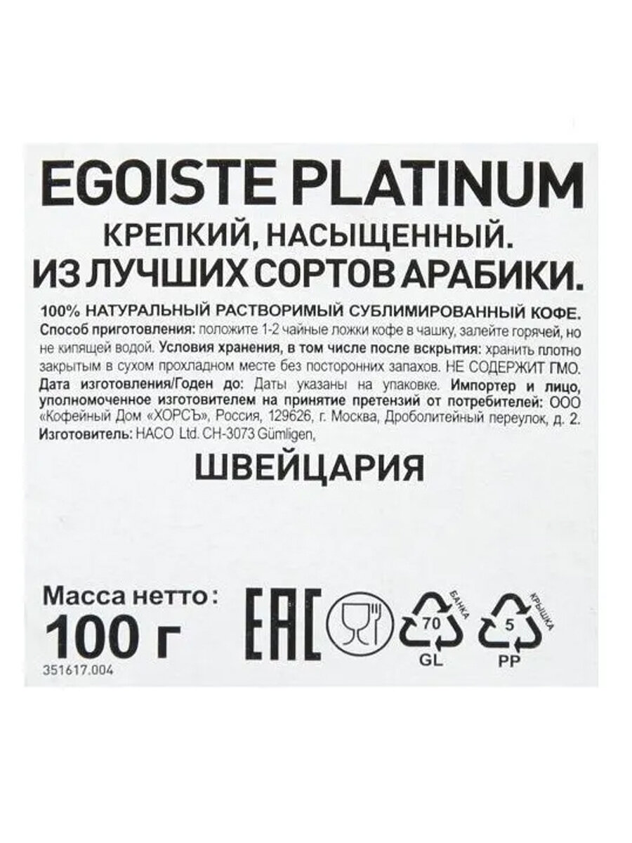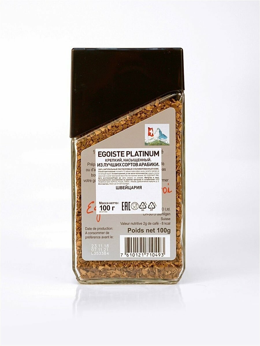 Кофе растворимый EGOISTE "Platinum" 100 г, стеклянная банка, сублимированный, швейцария, 8467