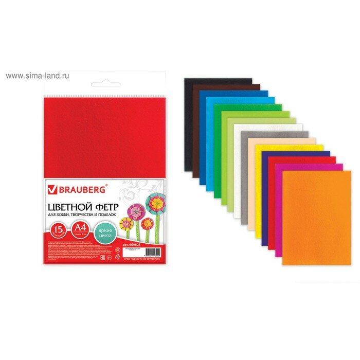 Купить Цветной фетр Brauberg для творчества А4 210*297 мм 15 л., 15 цветов, толщина 2 мм (660623)