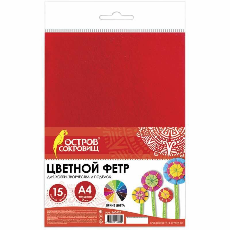Цветной фетр для творчества А4 15 л, 15 цв, толщ 2 мм, Остров сокровищ (660623)