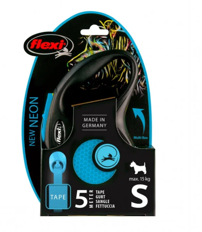Рулетка Flexi New Neon S, 5 м, 15 кг, лента, неоновый синий