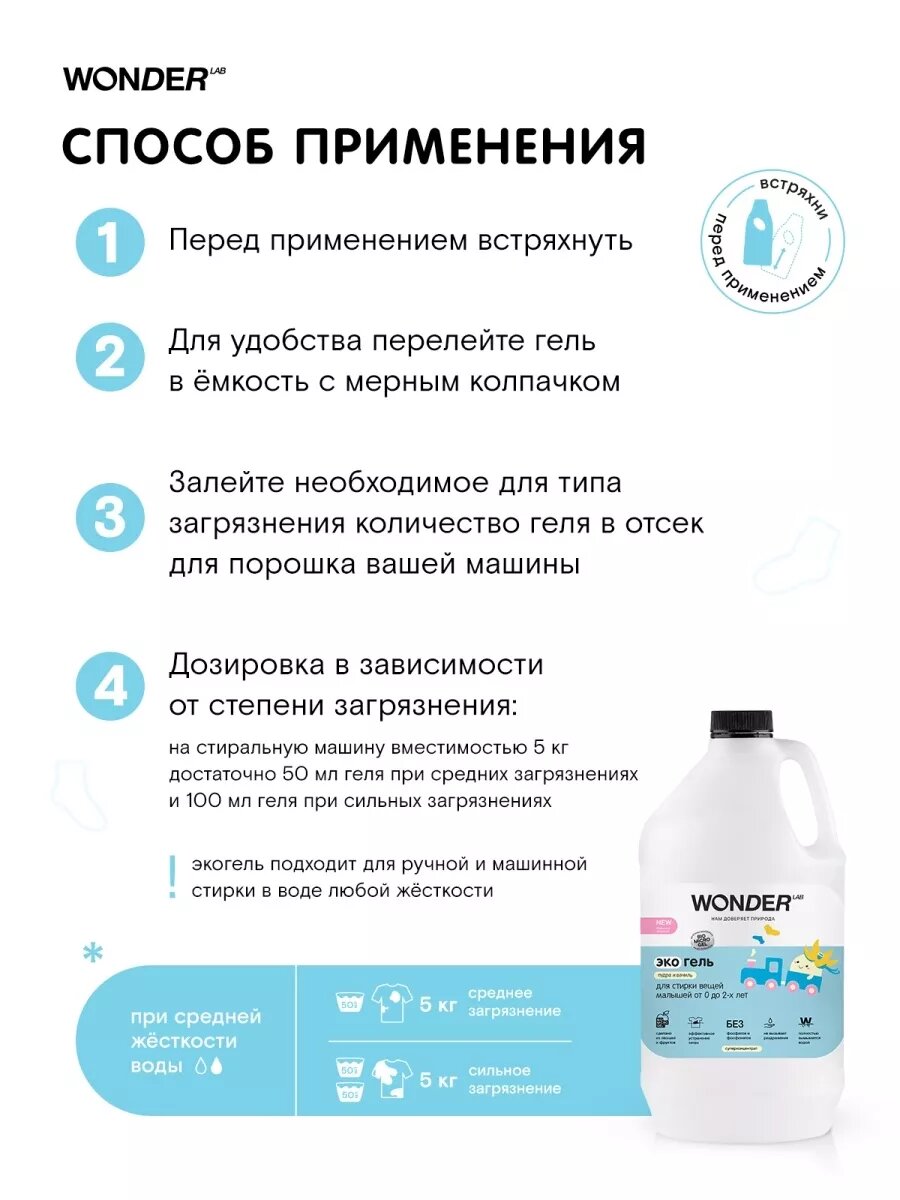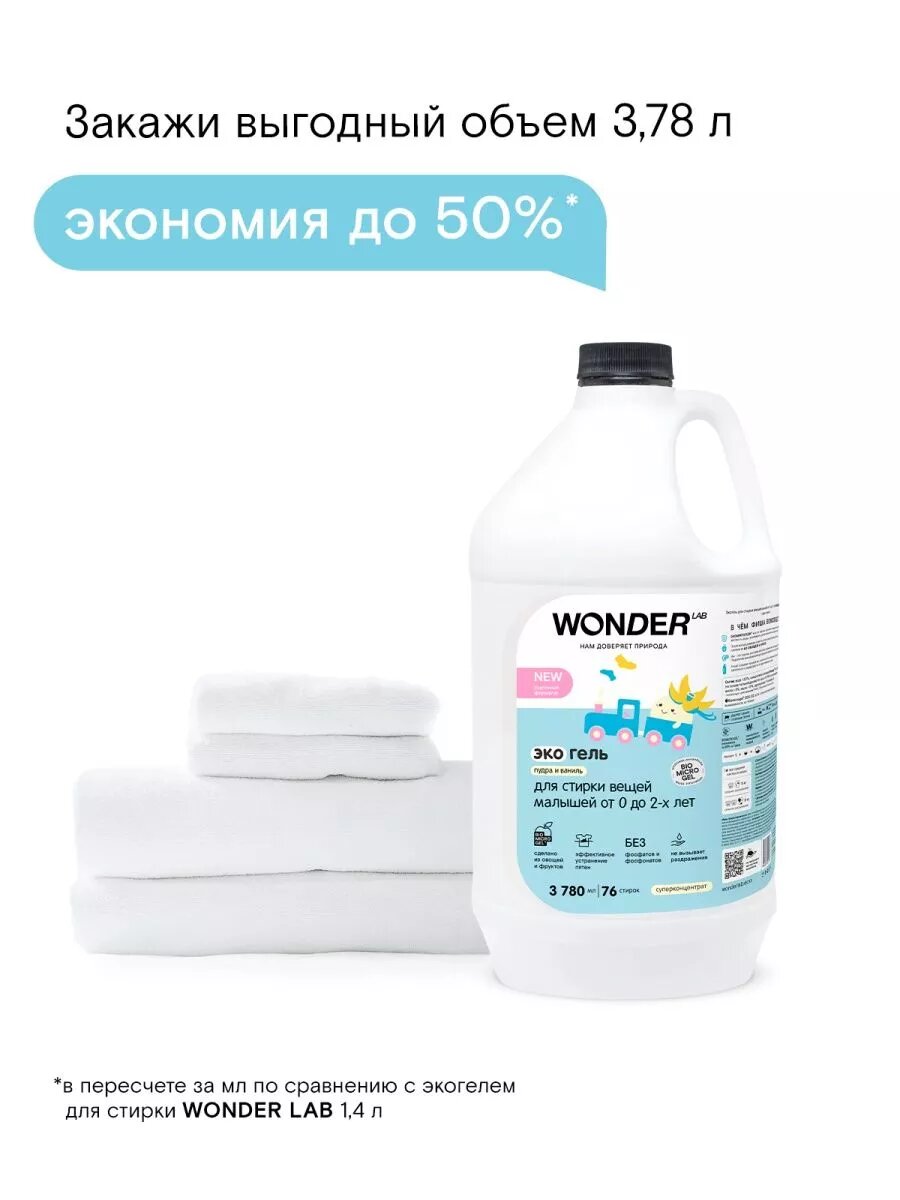 WONDER LAB Гель для детских вещей, до 2-х лет, пудра и ваниль, 3,78 л / интересное: