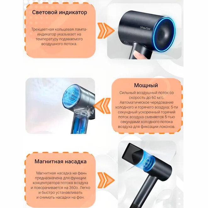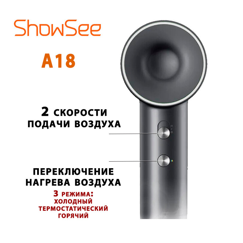 Фен для волос Xiaomi Showsee Hair Dryer A18 с магнитной насадкой концентратор и функцией ионизации разлаживающий волосы.