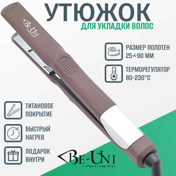 Утюжок BE-UNI профессиональный для укладки волос 25 мм титановый 80-230ºC BE128 Brown UNI STYLE