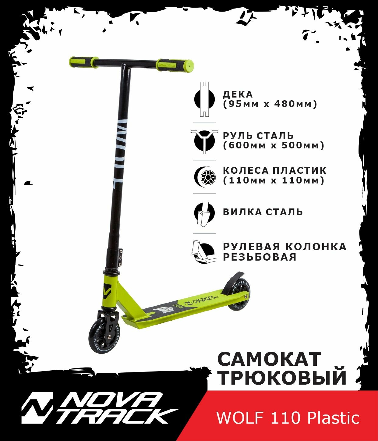 Novatrack Трюковой самокат Wolf 110 Plastic EL, черно-зеленый