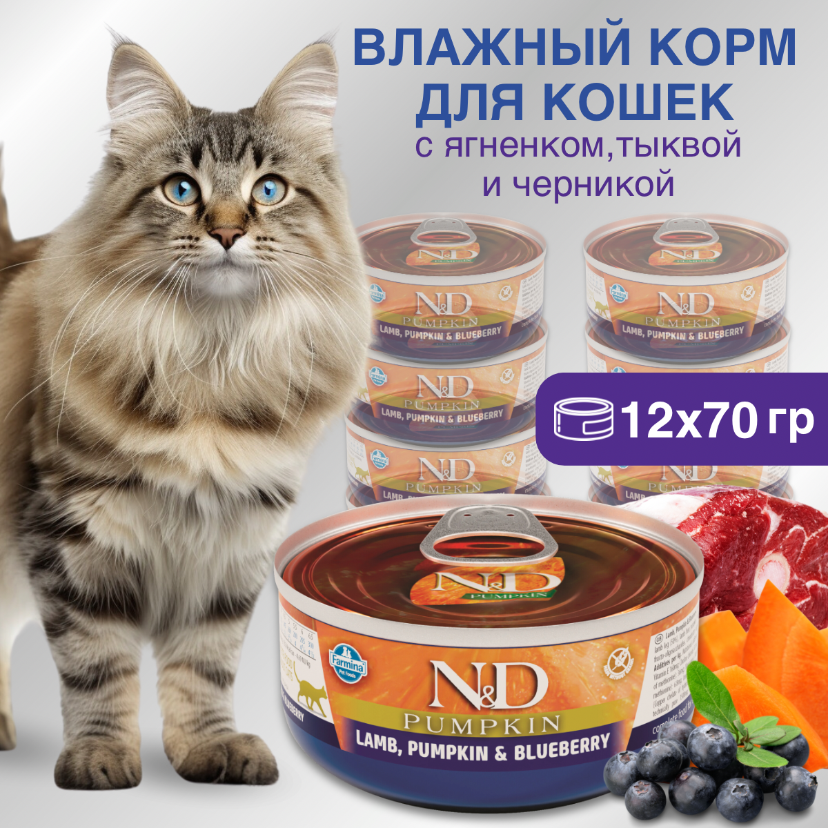 Влажный корм с ягненком, черникой и тыквой, для кошек, Farmina N&D, Lamb, Pumpkin & Blueberry, упаковка 12 шт х 70 г