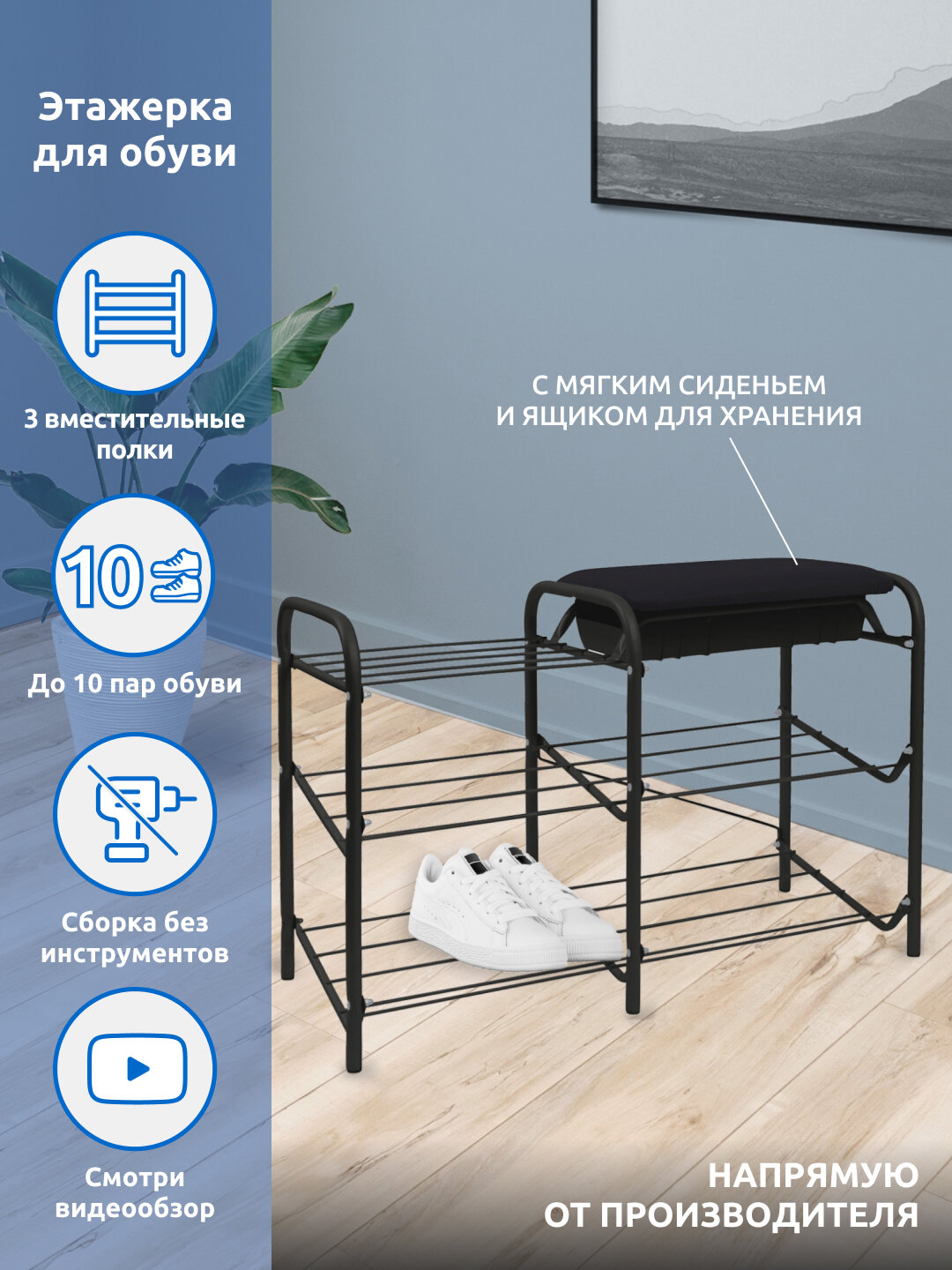 | Плюсы: | Надёжная конструкция, лёгкая сборка, вместительные и удобные отсеки для обуви и ящик для обувных мелочей. |