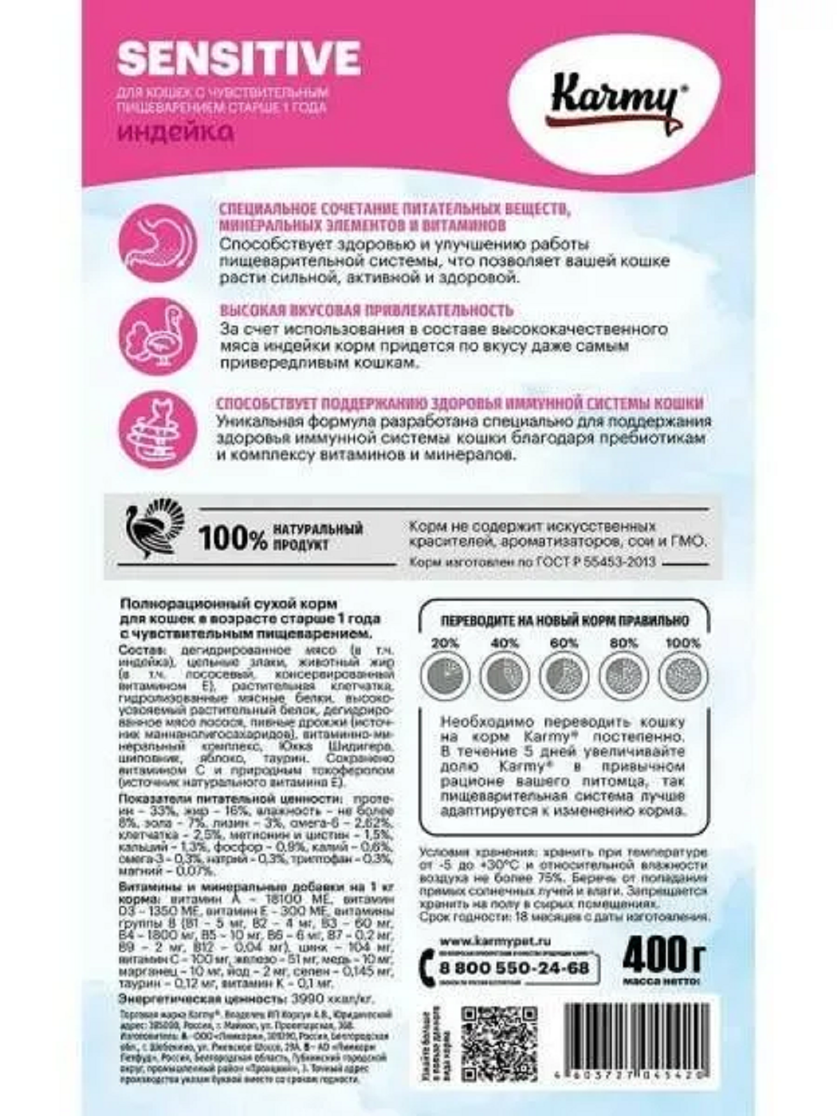 Karmy Sensitive корм для взрослых кошек с чувствительным пищеварением, индейка 400 г