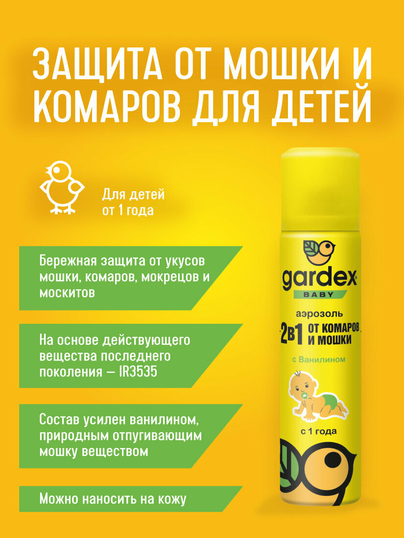 Средство от комаров и от мошки 2 в 1, Gardex Baby Аэрозоль от комаров и мошки для детей с 1 года 80 мл 1 шт