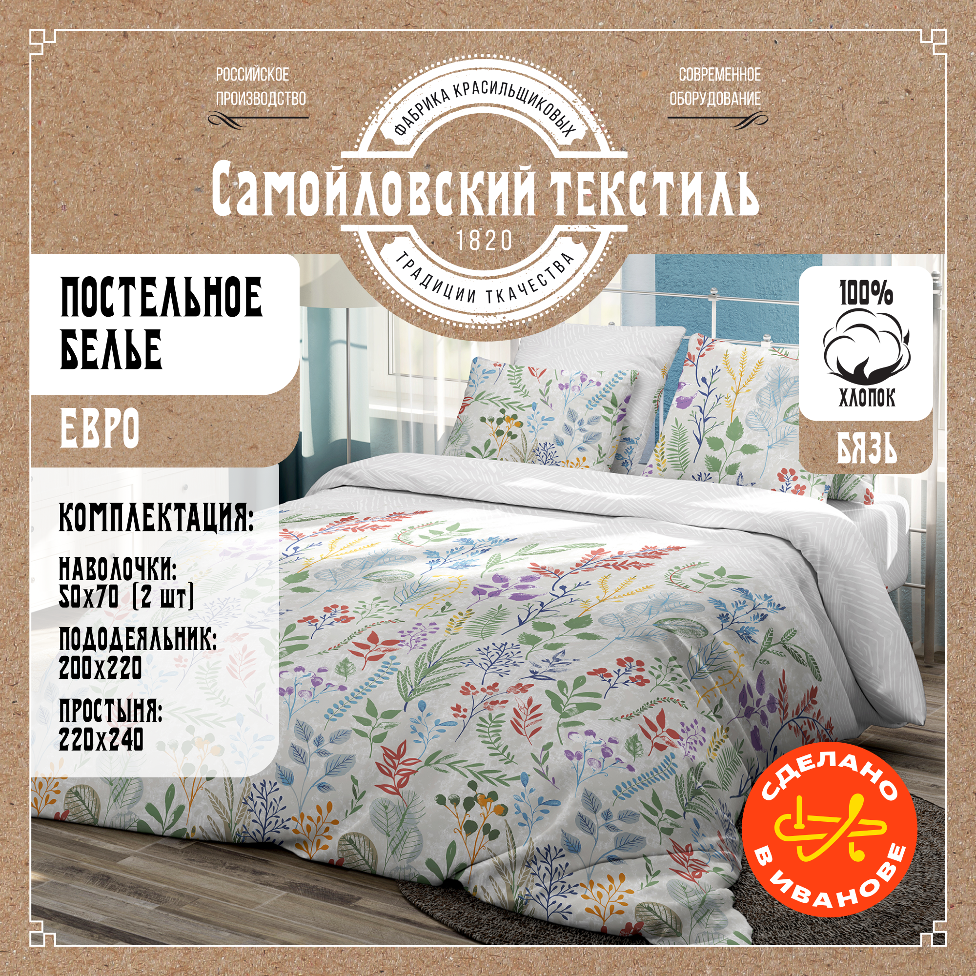 Комплект постельного белья из бязи Евро Самойловский текстиль дизайн Гербарий 220х240, 2 наволочки 50х70, пододеяльник 200х220, хлопок 100%
