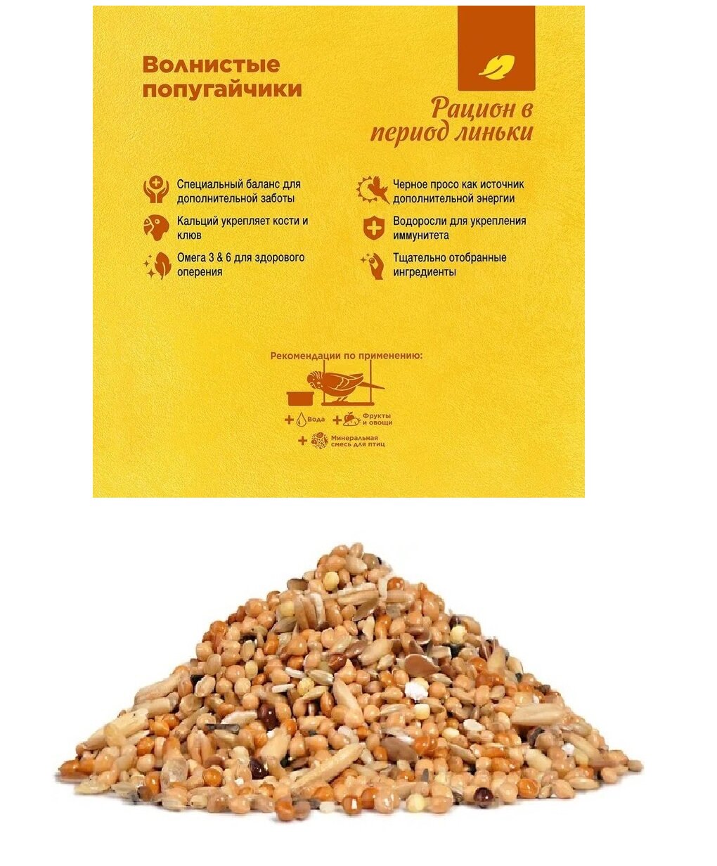 | Отзыв: | Отличный корм для птички во время линьки. |