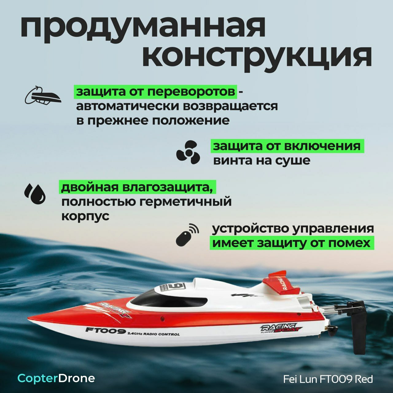 | Минусы: | Катер теряет связь с пультом управления . При вкл/выкл пульта связь не восстанавливается , на команды не реагирует … |
