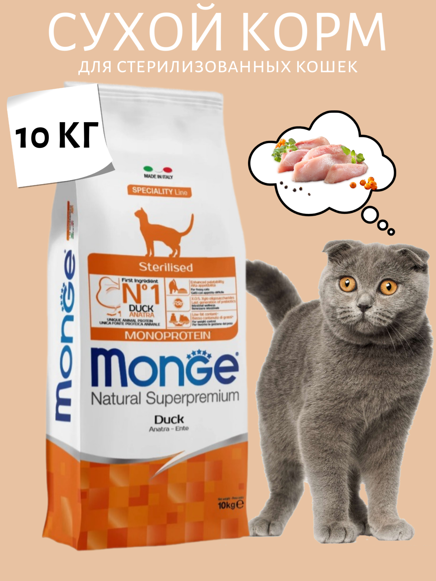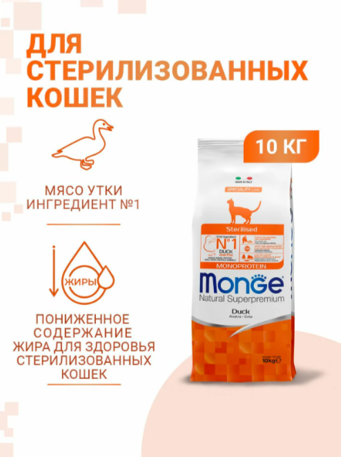 Monge Cat Monoprotein корм для стерилизованных взрослых кошек всех пород, утка 10 кг