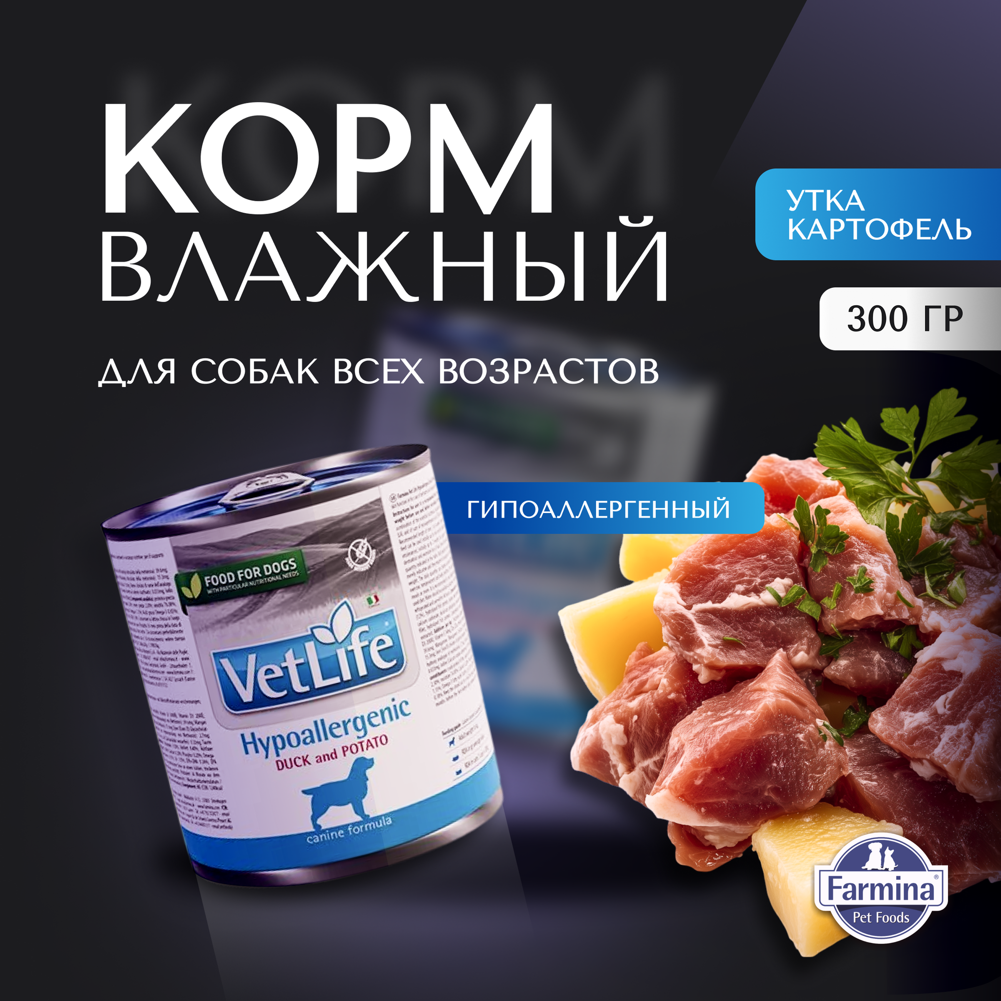 Влажный корм Farmina Vet Life Hypoallergenic для собак всех пород при пищевой аллергии или непереносимости ингредиентов, Фармина Вет Лайф гипоаллергенный рацион со вкусом утки и картофеля, 6шт по 300г