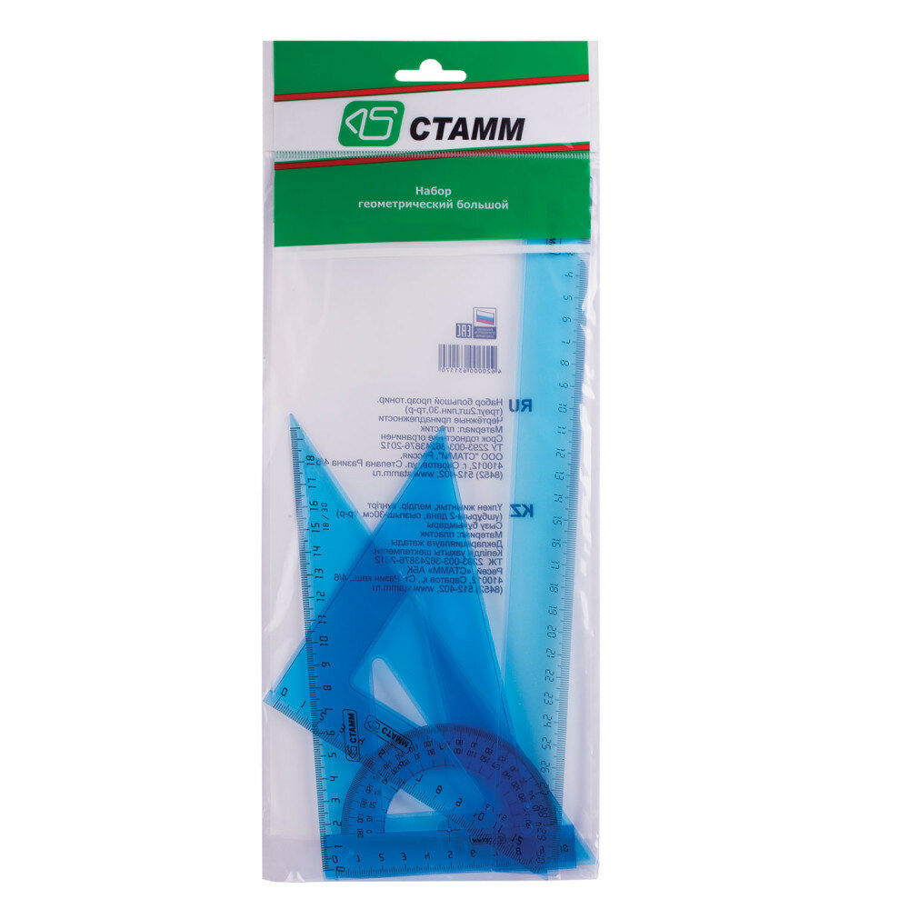 Стамм Набор чертежный большой, (треуг. 2шт., линейка 30см, транспортир), прозрачный тонированный