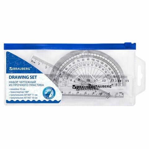 Набор чертежный малый BRAUBERG (линейка 15 см, 2 угольника, транспортир), конверт на молнии, 210306 - 1 шт.