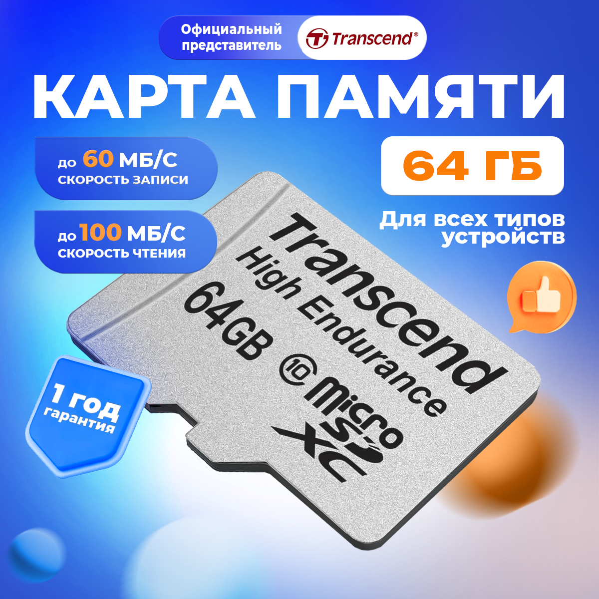 Карта памяти microSDXC UHS-I U1 Transcend 64 ГБ, 100 МБ/с, Class 10, TS64GUSD300S, 1 шт., переходник без адаптера