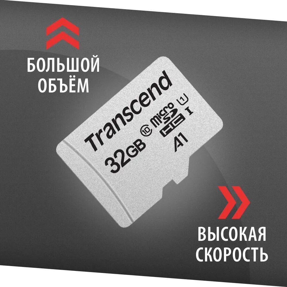 Карта памяти microSDHC UHS-I U1 Transcend 32 ГБ, 100 МБ/с, Class 10, TS32GUSD300S, 1 шт., переходник без адаптера