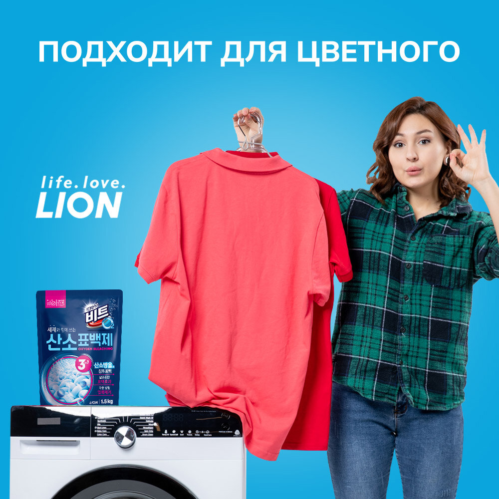 Lion Beat O2 Кислородный отбеливатель порошоковый дезинфицирующий 1,5 кг на 88 стирок