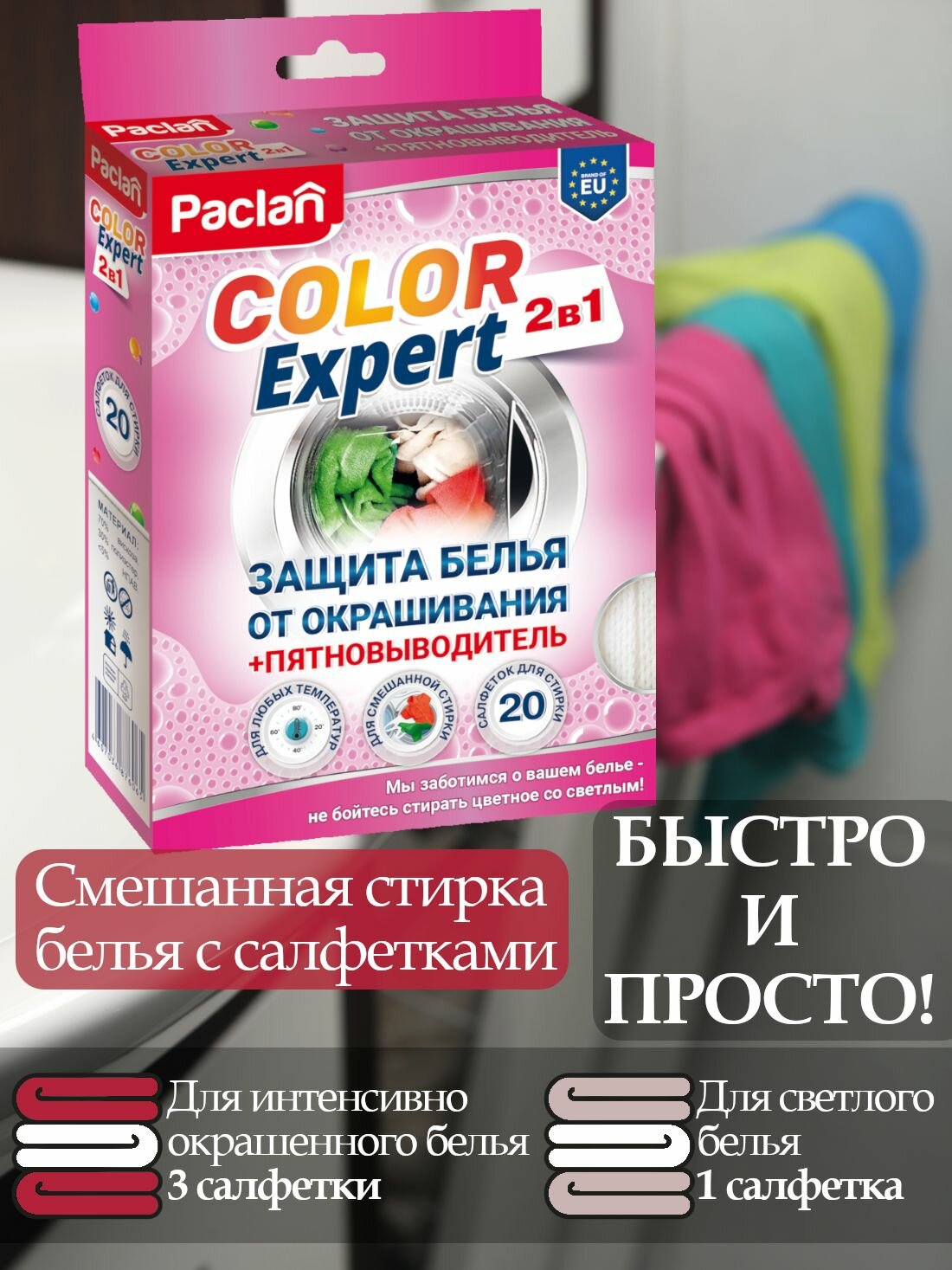 Paclan Салфетки Color Expert 2в1 для защиты белья от окрашивания, пятновыводитель, 20 шт в уп.