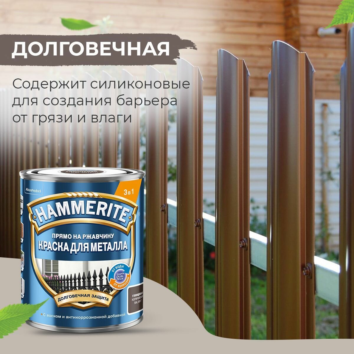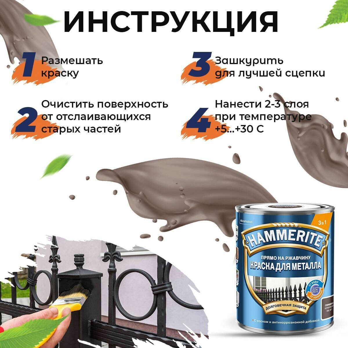 Краска для металла 3 в 1 прямо на ржавчину Hammerite молотковая (2л) коричневый RAL8017
