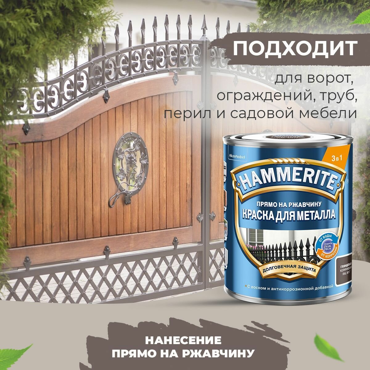 Краска для металла 3 в 1 прямо на ржавчину Hammerite гладкая глянцевая (0,75л) коричневый RAL 8017
