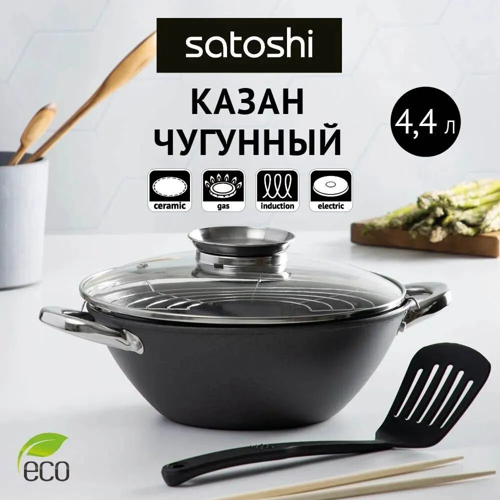 Казан 4,4л 30см (чугун) аП, нержавеющая сталь/руч, стекляная крышка, нейлон.лопат Satoshi