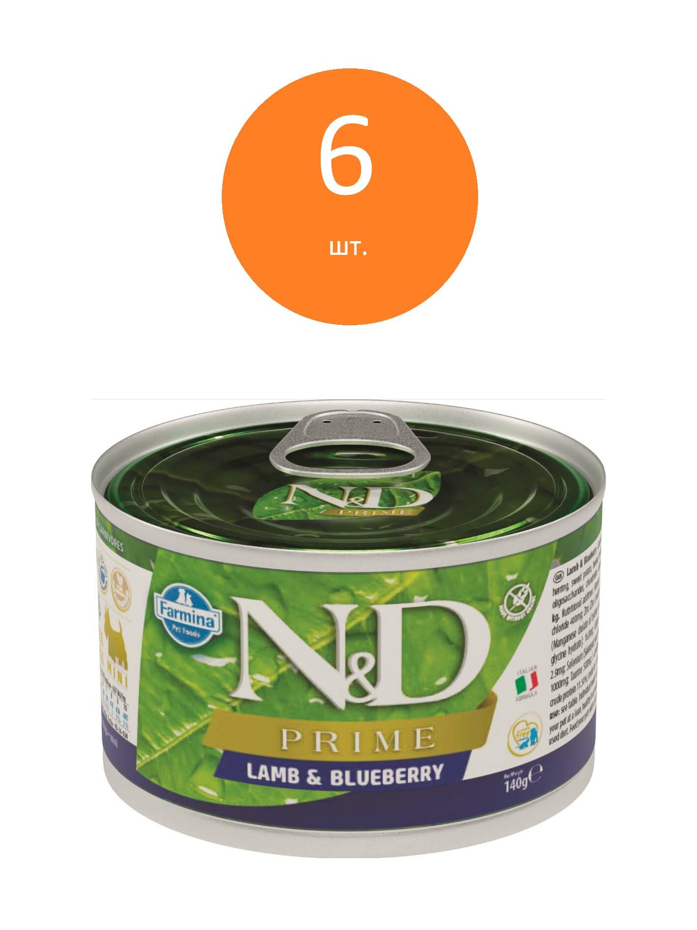 Farmina N&D Dog Prime Adult Mini консервы для взрослых собак мелких пород Ягненок и черника, 140 г. упаковка 6 шт