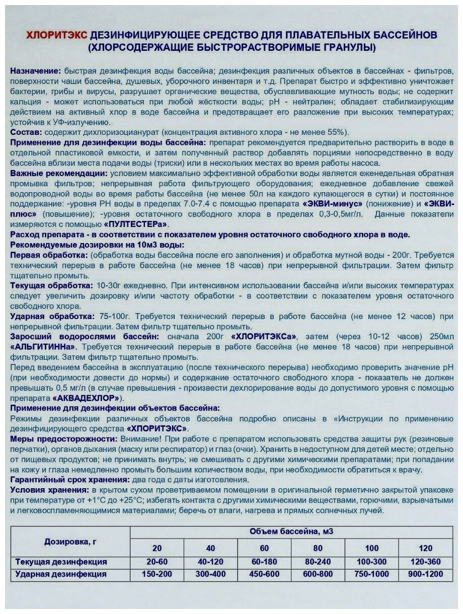 Гранулы для бассейна, Хлоритэкс 1кг, быстрорастворимый (ударный) хлор