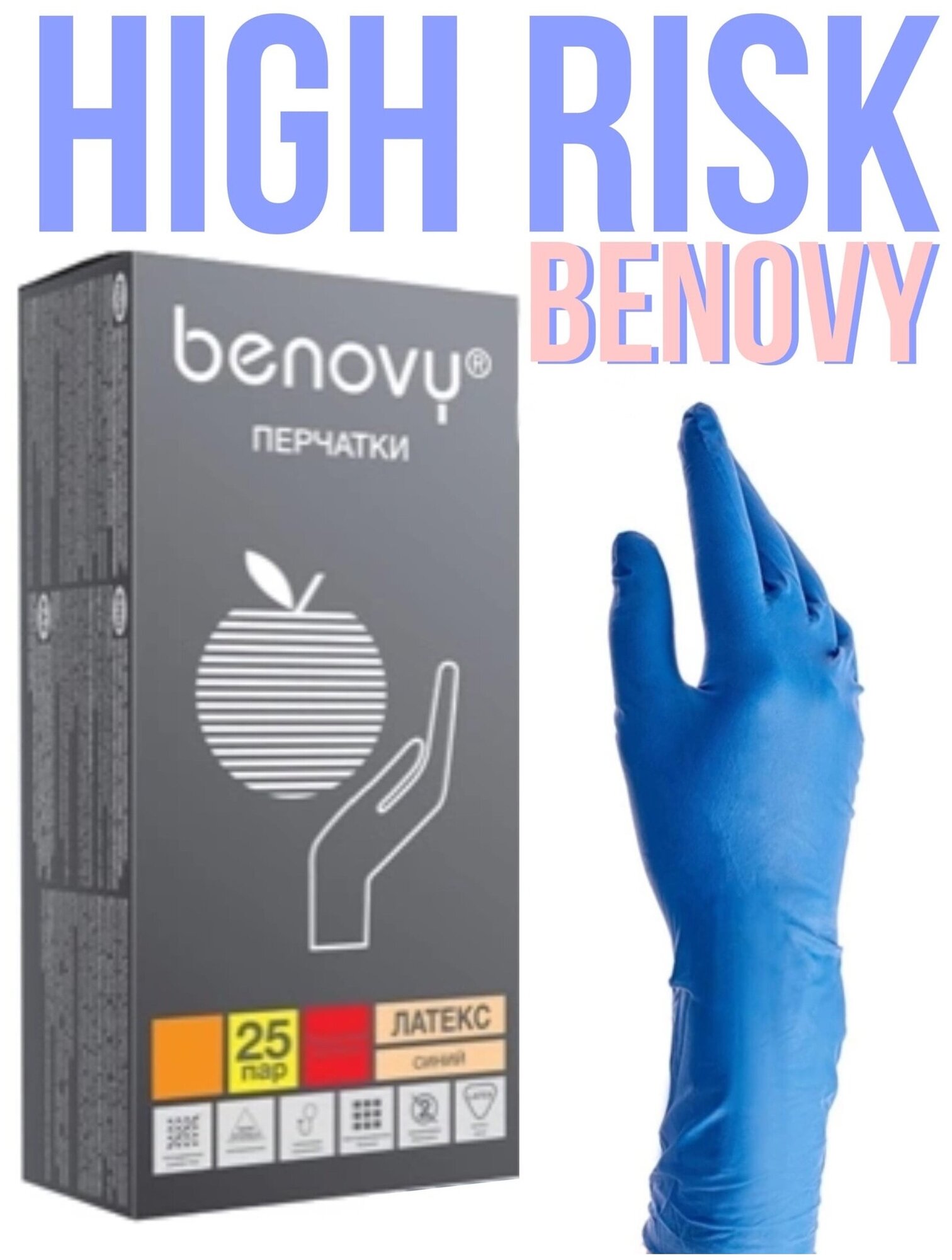 Перчатки латексные Benovy смотровые High Risk 25 пар (50 шт.), размер S (малый), синие, -