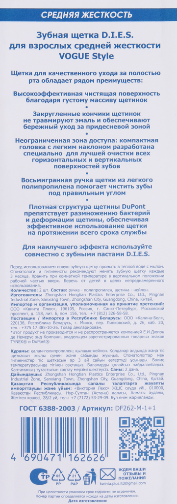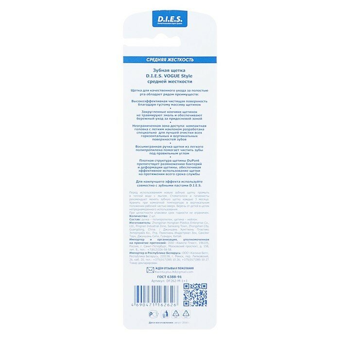 D.I.E.S. Зубная щётка D.I.E.S. Vogue Style средней жёсткости, 1+1 шт. интересное: