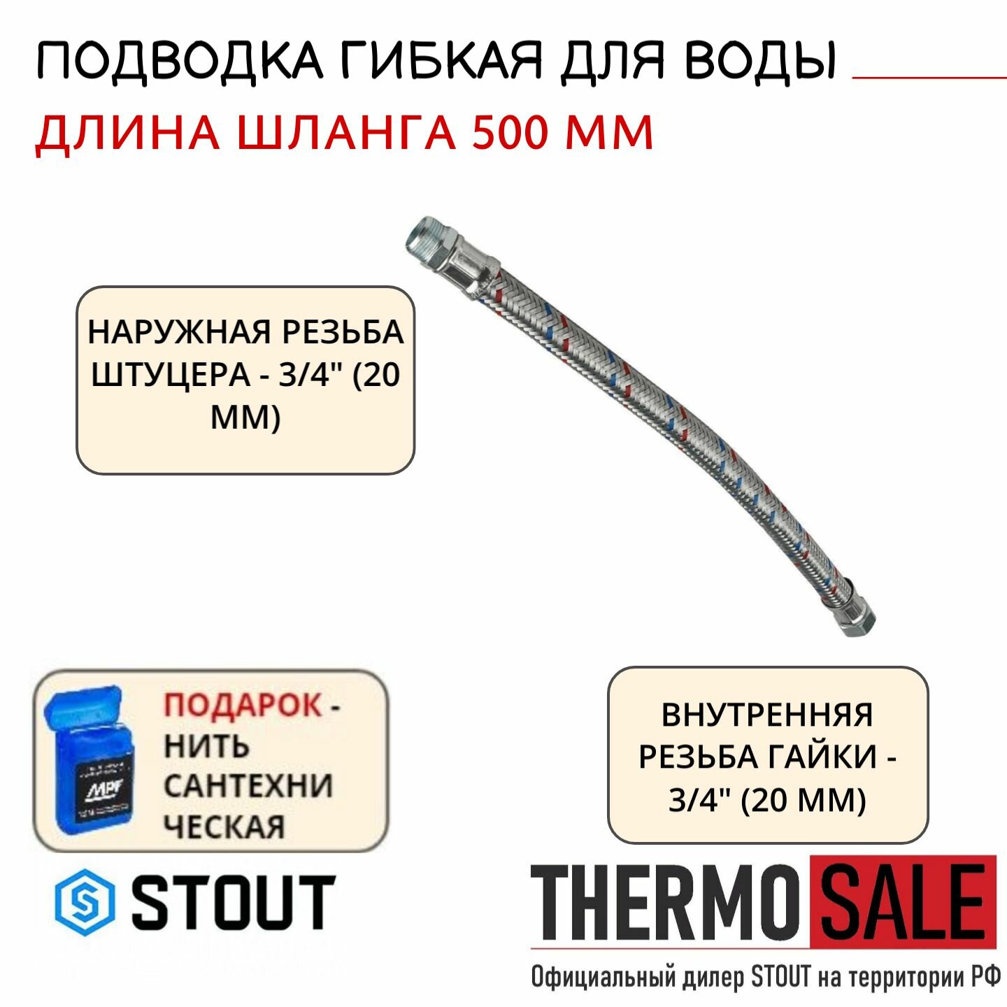 Гибкая подводка для воды НР 3/4 х ВР 3/4, длина 300 мм STOUT Сантехническая нить 20 м