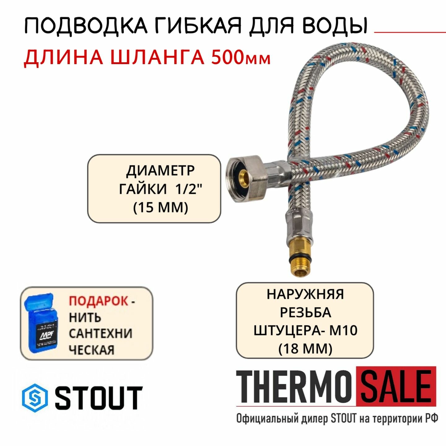 Подводка под смеситель гибкая STOUT SHF-1018 - M10(18мм) x 1/2" (Смеситель/Гайка, длина 500 мм)