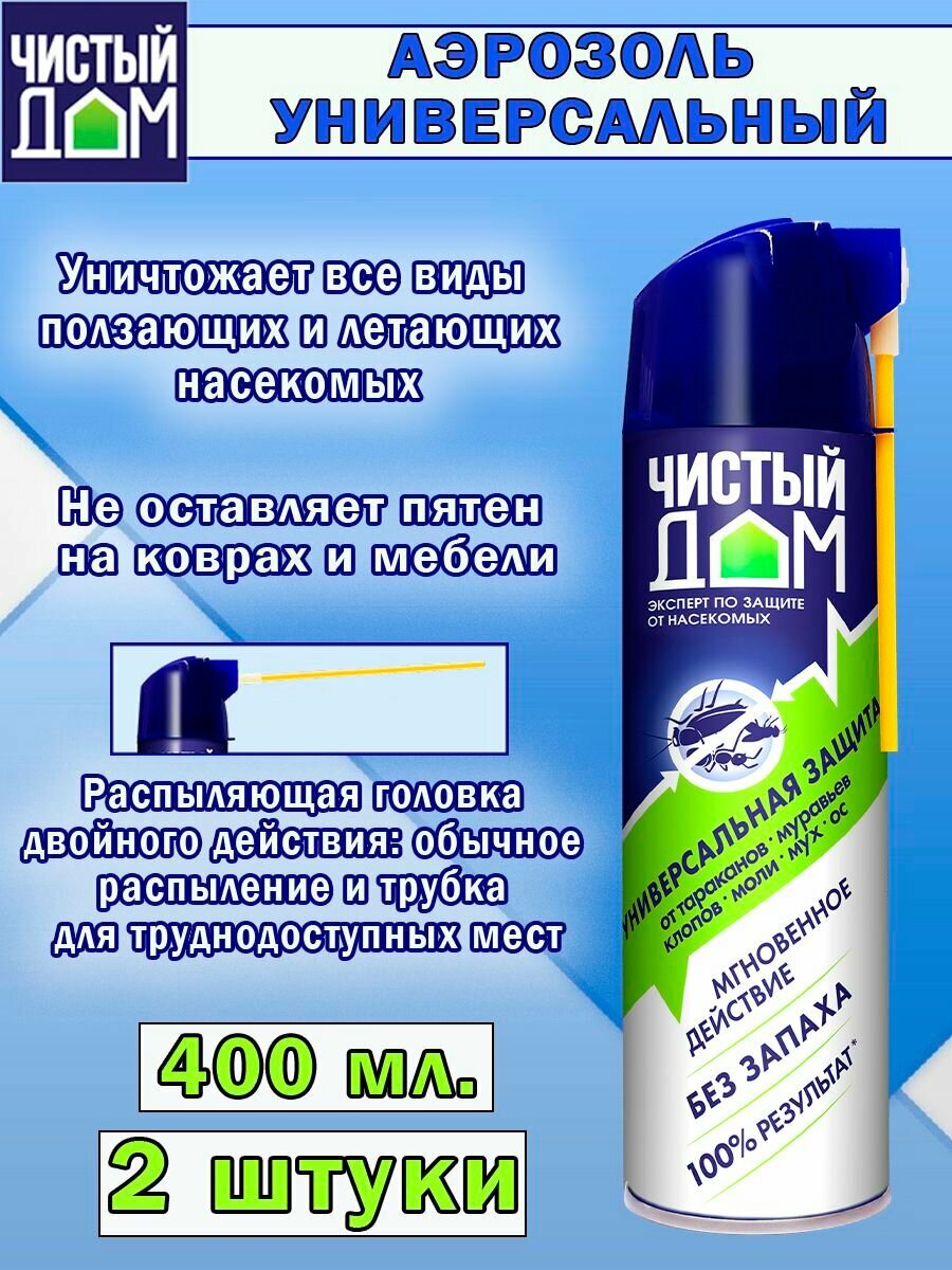 Чистый Дом универсальный аэрозоль от клопов, тараканов, блох, муравьев, мух, ос, моли (без запаха), 400 мл