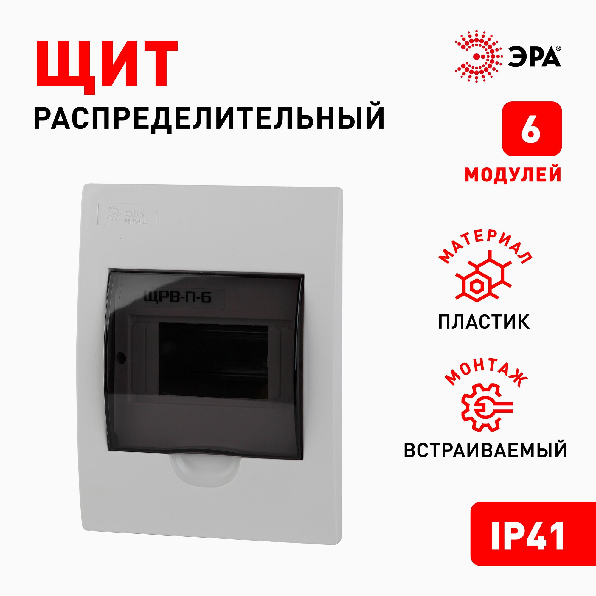 Щит распределительный встраиваемый ЭРА ЩРВ-П-06 SIMPLE пластиковый с дверцей IP41, 211х171х86 мм