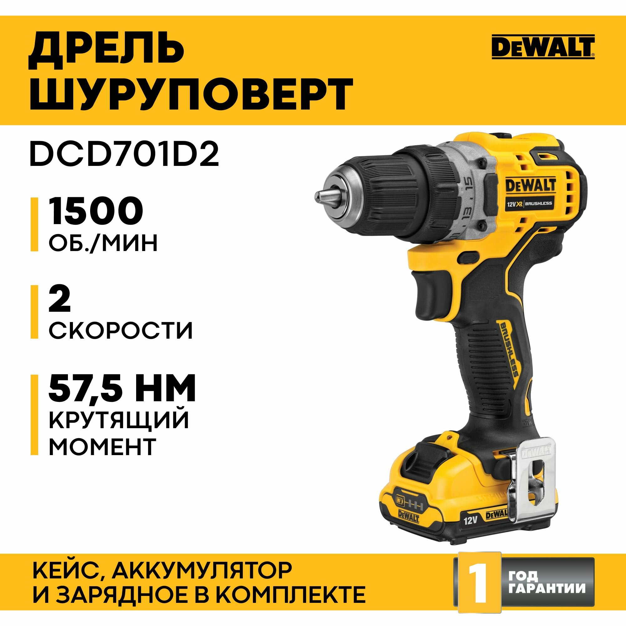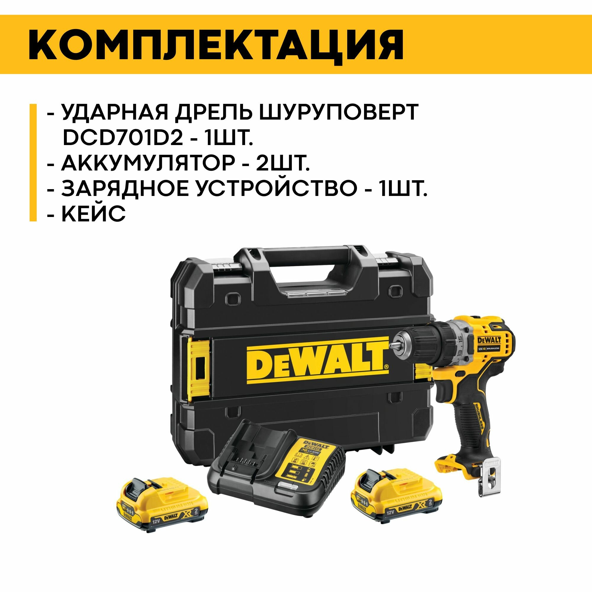 Дрель аккумуляторная бесщёточная DeWalt DCD701D2 12В Li 2_0Ач 57_5Нм 10мм кейс
