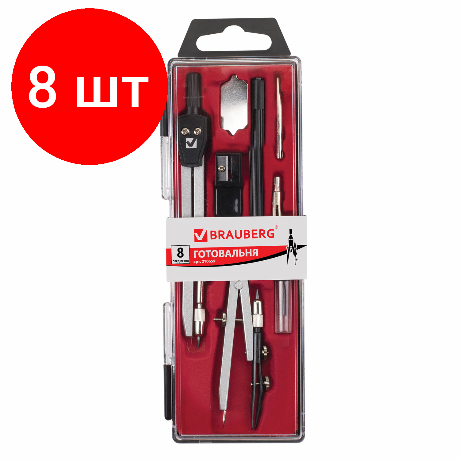 Комплект 8 шт, Готовальня BRAUBERG "Architect", 8 предметов: циркуль + кронциркуль, вставки + держатель, отвёртка, точилка, грифель, 210659