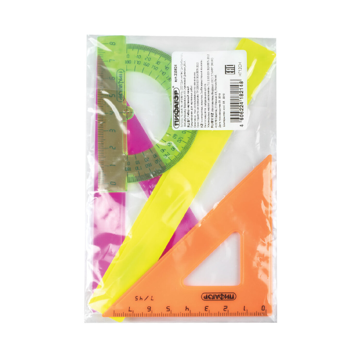 Набор чертежный малый пифагор (линейка 16 см, 2 треугольника, транспортир), непрозрачный, неоновый, пакет, 210624, 210624