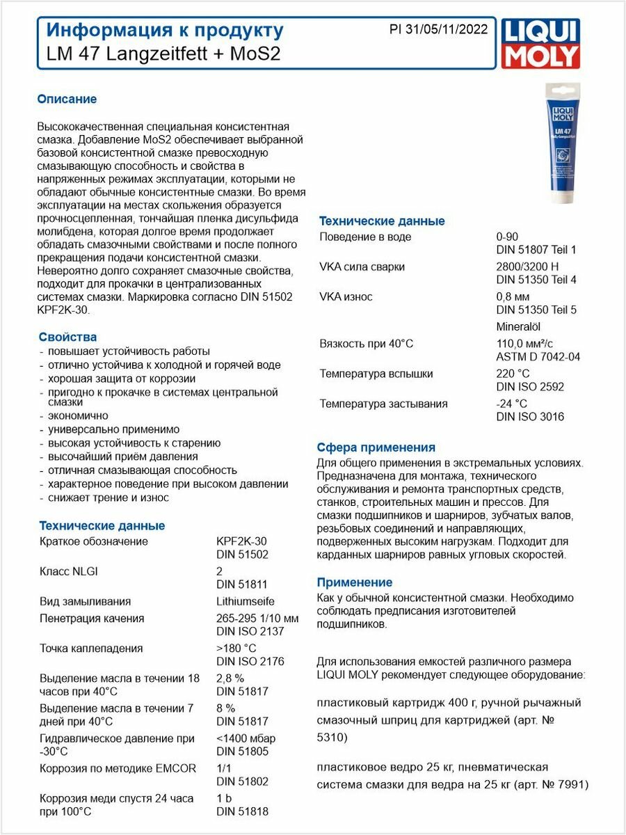 Liqui moly lm 47 langzeitfett + mos2 смазка шрус с дисульфидом молибдена 0.100 л (1987)
