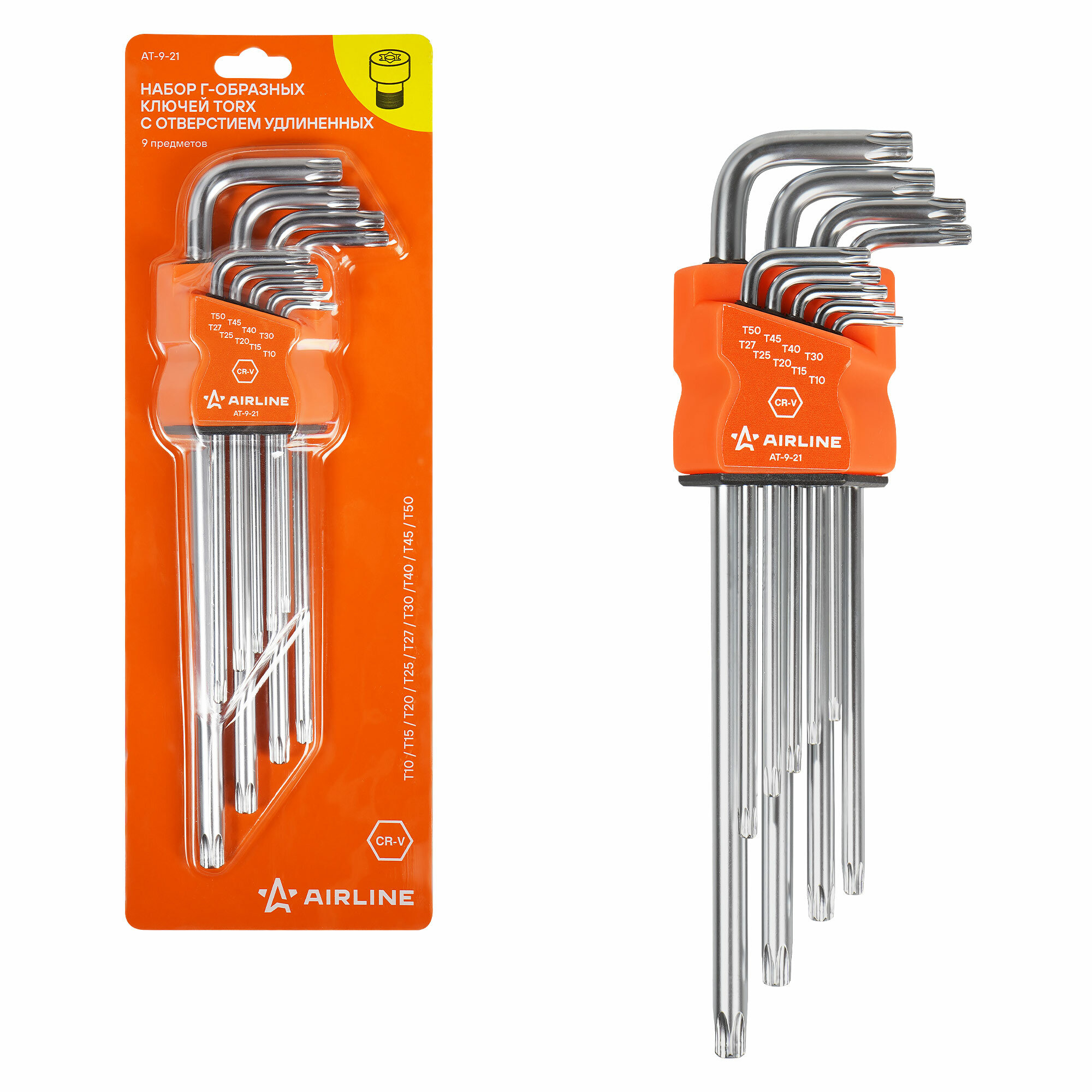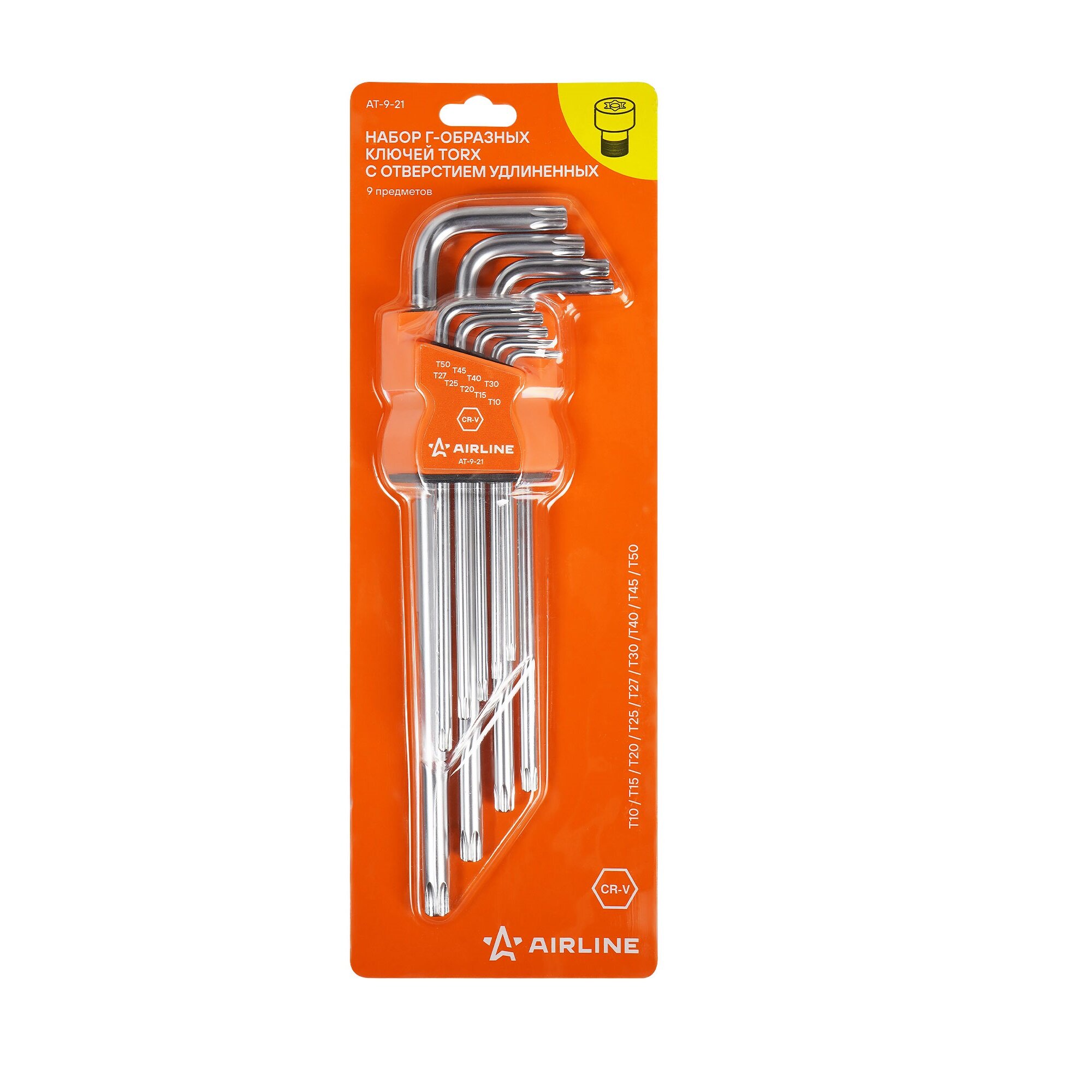AIRLINE / at921 / Набор Г-образных ключей TORX с отв. удлинённых 9 предметов (Т10, Т15, Т20, Т25, Т27, Т30, Т40, Т45, Т50) пласт.подвес