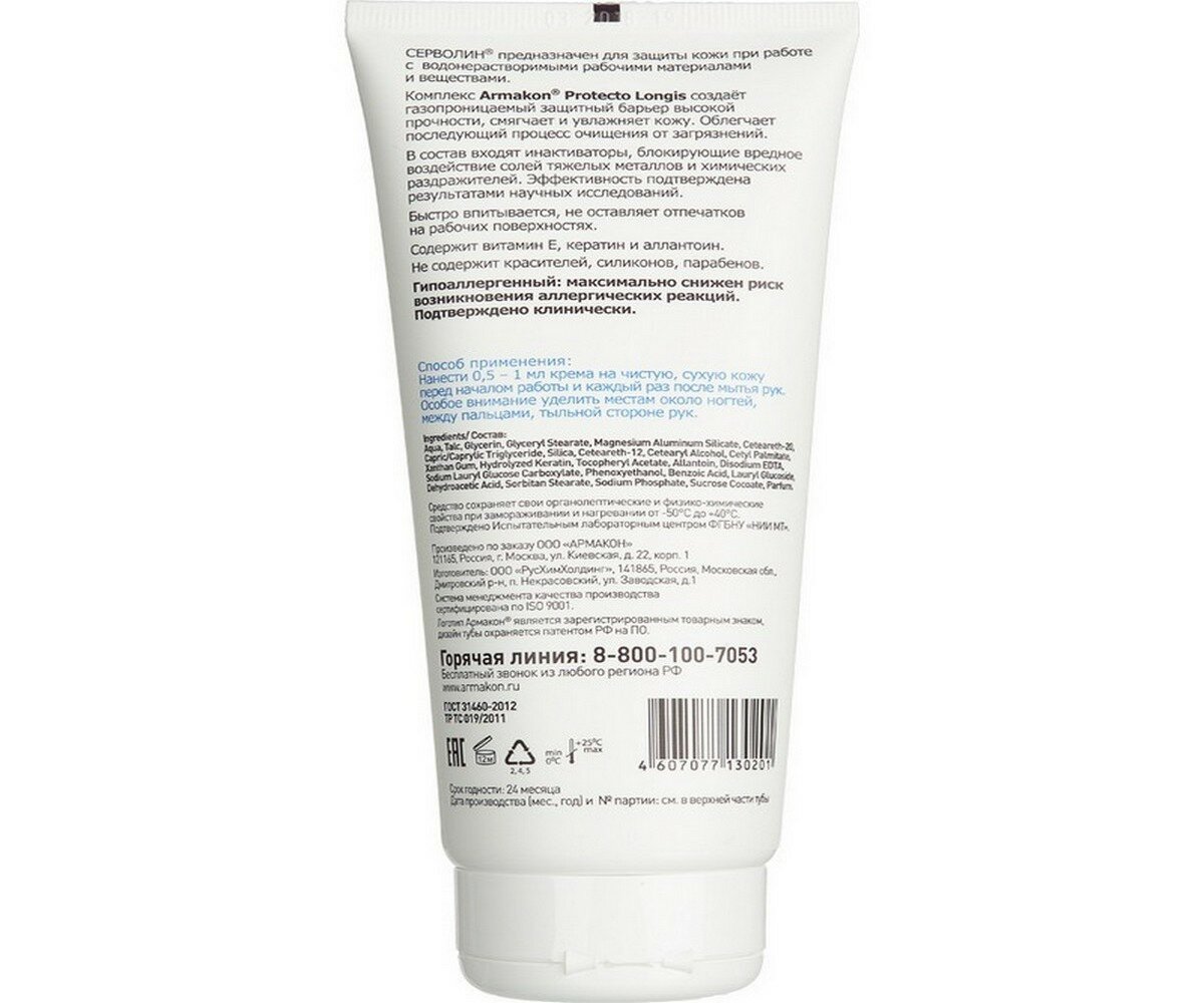 Крем защитный, 100 мл, армакон "серволин", гидрофильный, от нефтепродуктов, смазочно-охлаждающих жидкостей, красок, 1197 (цена за 1 ед.товара)