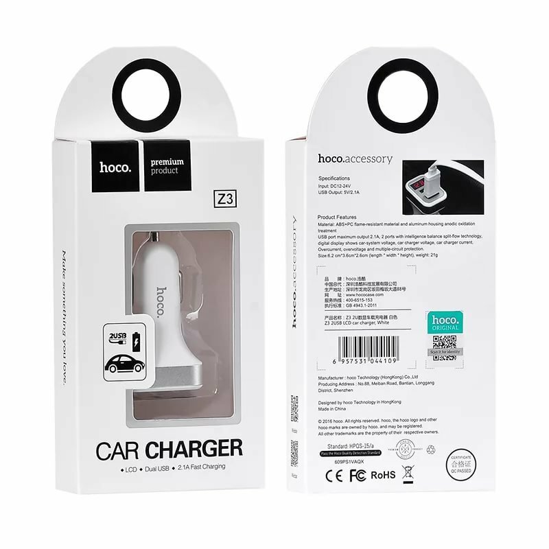 Автомобильная зарядка (от прикуривателя) HOCO z3, быстрая зарядка, два порта USB, LCD, 5V, 3.1A, белая