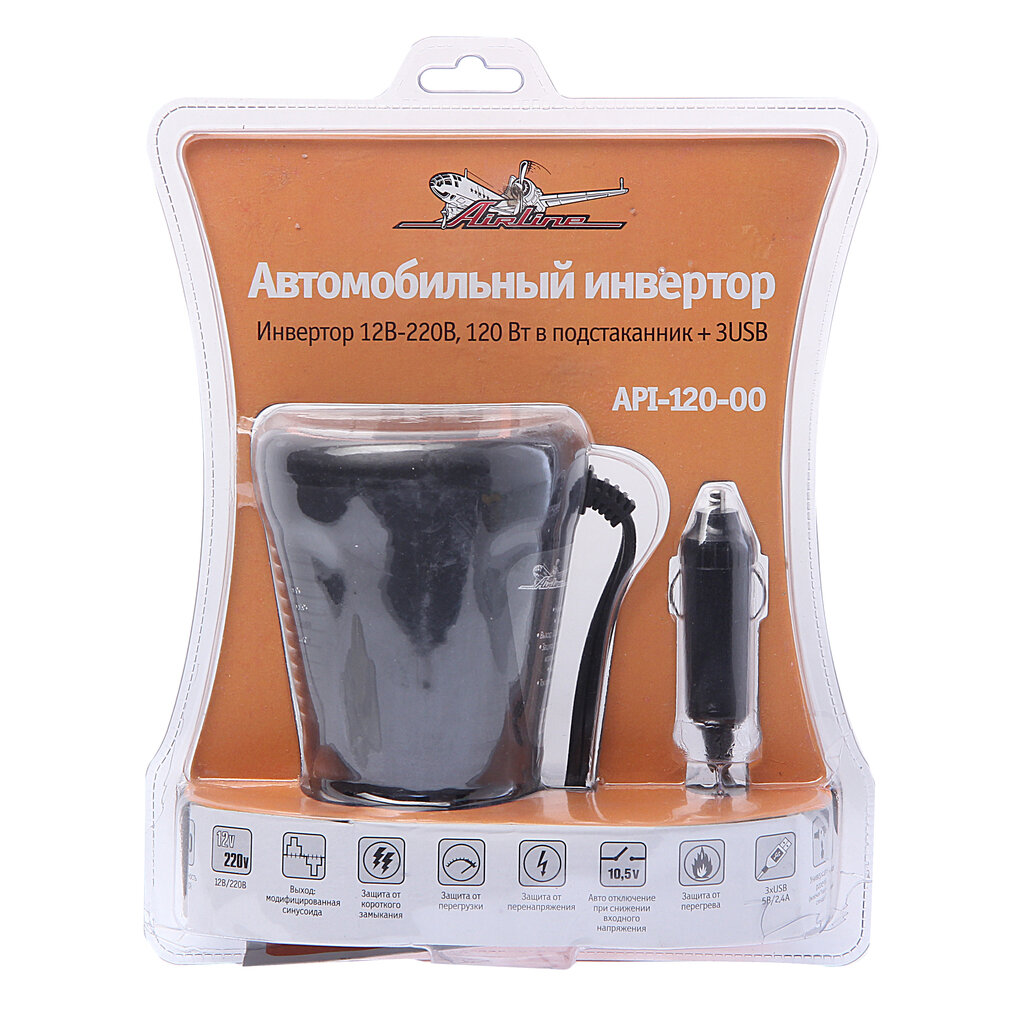 AIRLINE API-120-00 Инвертор 12В-220В 120 Вт в подстаканник + 3USB (API-120-00)