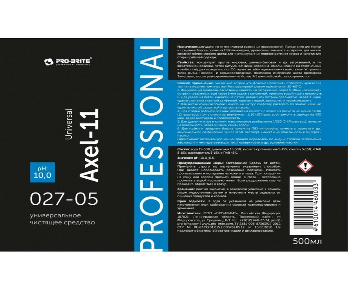 Промышленная химия Pro-Brite Axel-11 Universal, универсальное чистящее средство, 500мл (027-05)