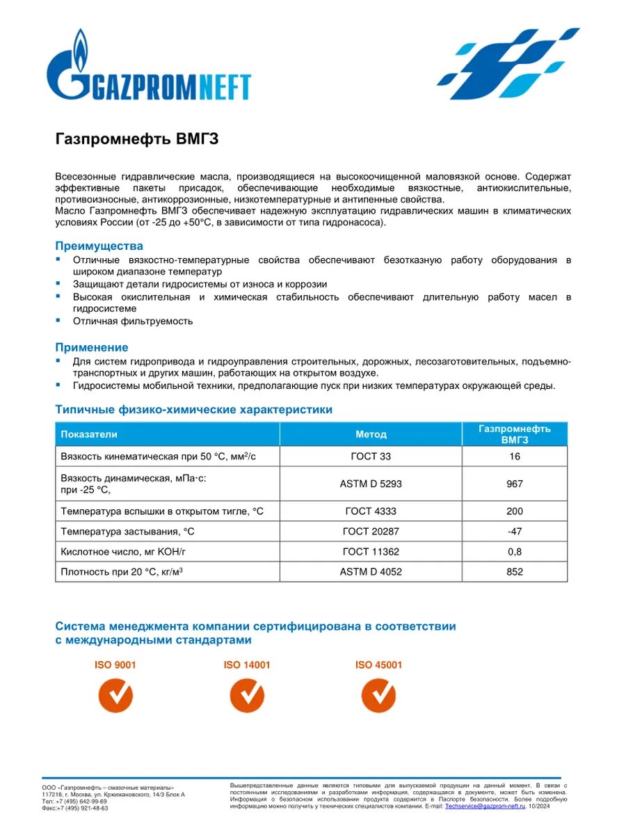 Гидравлическое масло Gazpromneft ВМГЗ Синтетическое, 10л