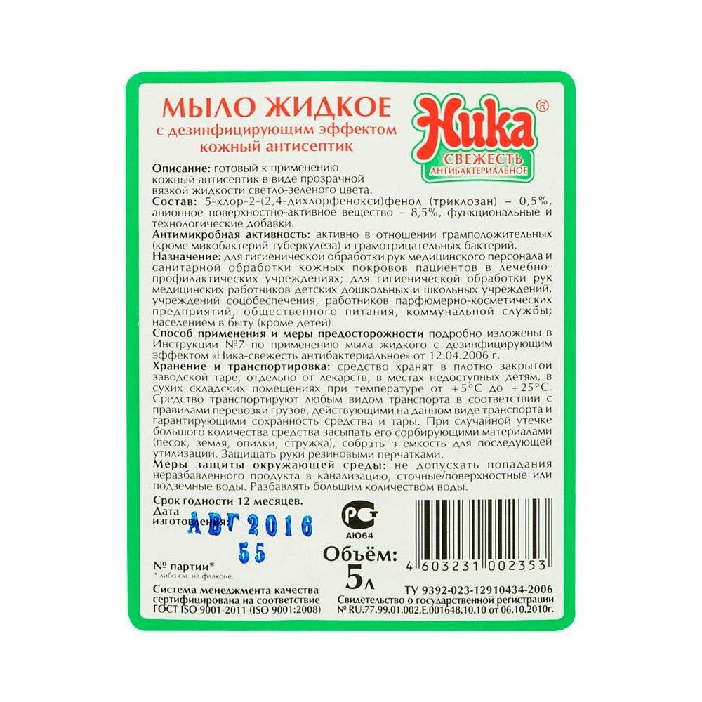 Мыло жидкое Ника дезинфицирующее 5 л, "Свежесть", антибактериальное ()